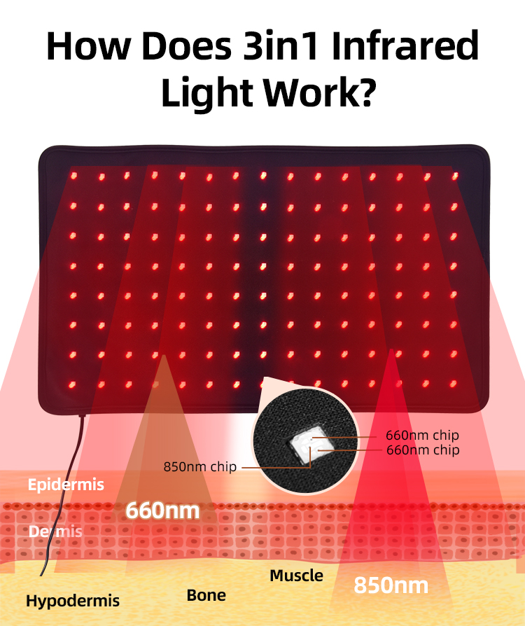 【Red light therapy lamps device】Red light therapy lamp each light includes 1pcs 660nm red light (visible) + 2pcs 850nm infrared light (invisible) can gives you more comprehensive Skin Care. Red light device with 660 and near-infrared 850nm is the best combination wavelength for therapy by penetrate and cause thermal effects to increase tissue temperature, promote blood circulation, enhance metabolism, improve cell vitality.