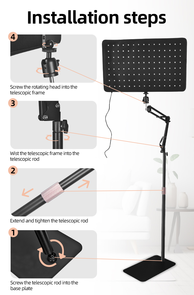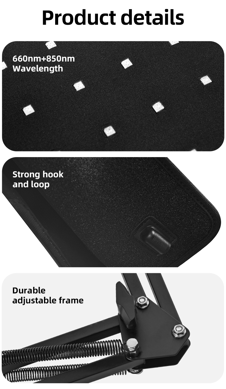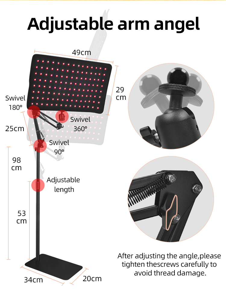【360° rotatable & detachable】The red light therapy lamp with stand is equipped with an adjustable arm and 360° rotating ball, you can adjust the light therapy angle arbitrarily to meet different needs. The red light therapy device can be easily installed in just 3 steps without any additional tools. The red light therapy panel is detachable to be used as a red light therapy belt and tablet stand. Create more comfort and vitality for your daily life