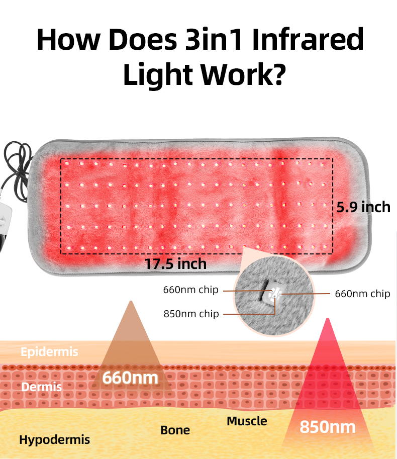 Dual Wavelength - 3-in-1 Light Bead This red light therapy pad uses a 2:1 combination of 660nm visible red light and 850nm near infrared light. The 660nm red light helps improve the health of the skin's surface, while the 850nm invisible infrared light penetrates deep into muscles and joints to provide deep support. It is a gentle, non-invasive daily care product that helps to rejuvenate after long hours of work, sports or travel