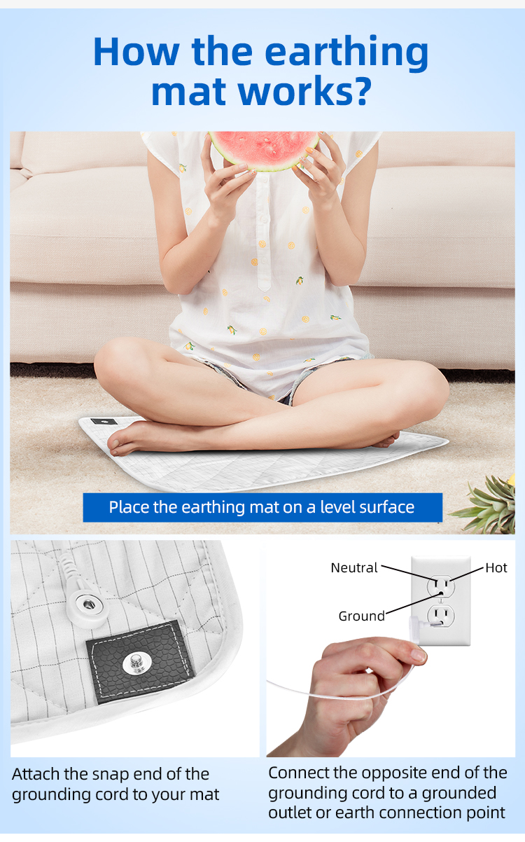 【How to use】 Grounding can be initiated simply by direct skin contact with the mat, with snap end of the cord plugged into the mat's button and the plug end plugged into a wall outlet