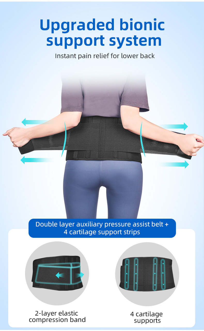 Designed for operational ease, the lower back support system provides breathability to prevent overheating during extended use, crucial for user adherence in demanding environments. Its elasticity balances firm assistance with freedom of movement, minimizing user fatigue and enhancing compliance with daily safety regimens. Adjustable sizing ensures tailored compression, essential for pain mitigation and postural correction. The product's compatibility with various physical activities and work conditions promotes broad usability, improving workplace ergonomics and reducing injury rates. This pragmatic performance orientation facilitates measurable benefits in both recovery support and proactive injury prevention measures.