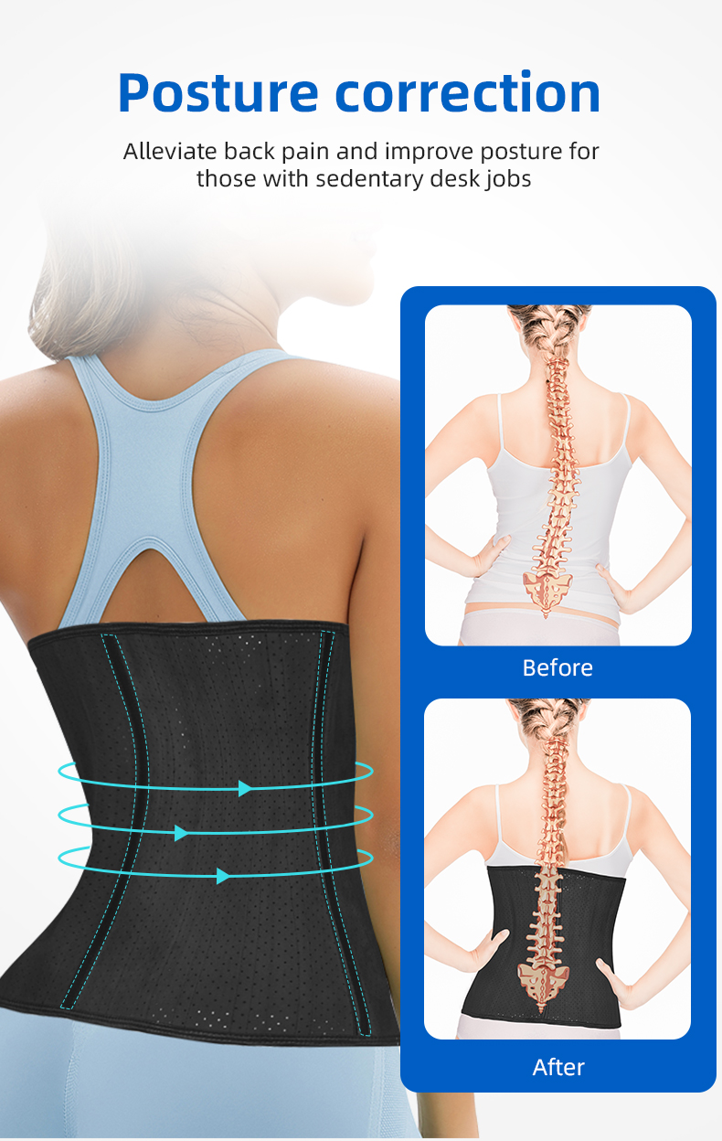 This belt incorporates 25 spiral steel bones offering structured reinforcement while maintaining flexibility, thus ensuring optimal lumbar support brace function. Its composite materials blend latex, spandex, cotton, and bamboo fiber to deliver high compression with breathable comfort. The large wide three-column hook-and-eye closure system allows precise fit customization. These technical features culminate in measurable benefits of adjustable compression levels and durability. The steel boning’s spring properties stabilize the lumbar and abdominal regions, facilitating improved posture with minimal restriction to movement. This combination meets quality standards for durable and breathable waist support belts suitable in industrial or medical device supply.