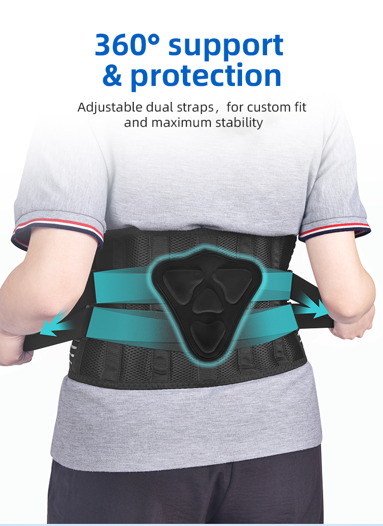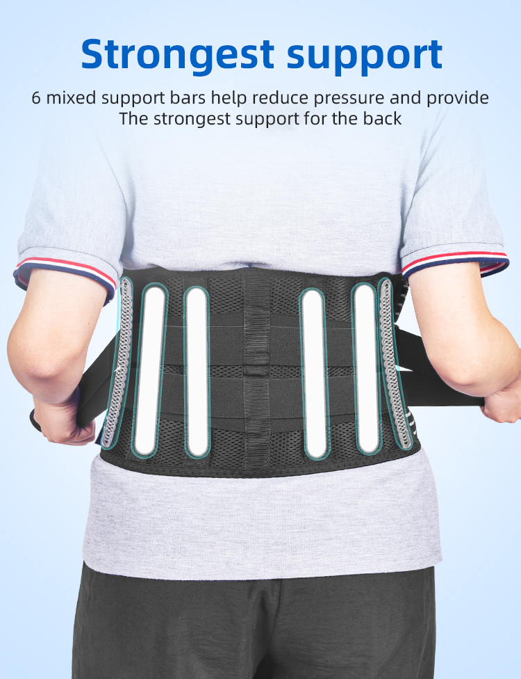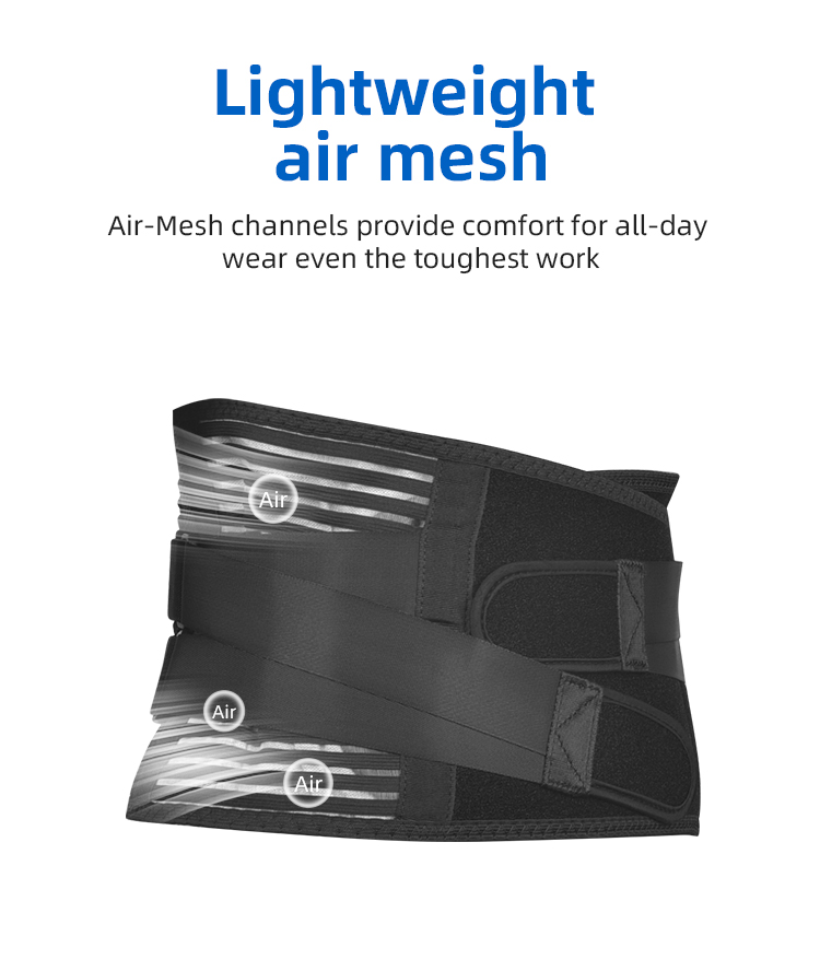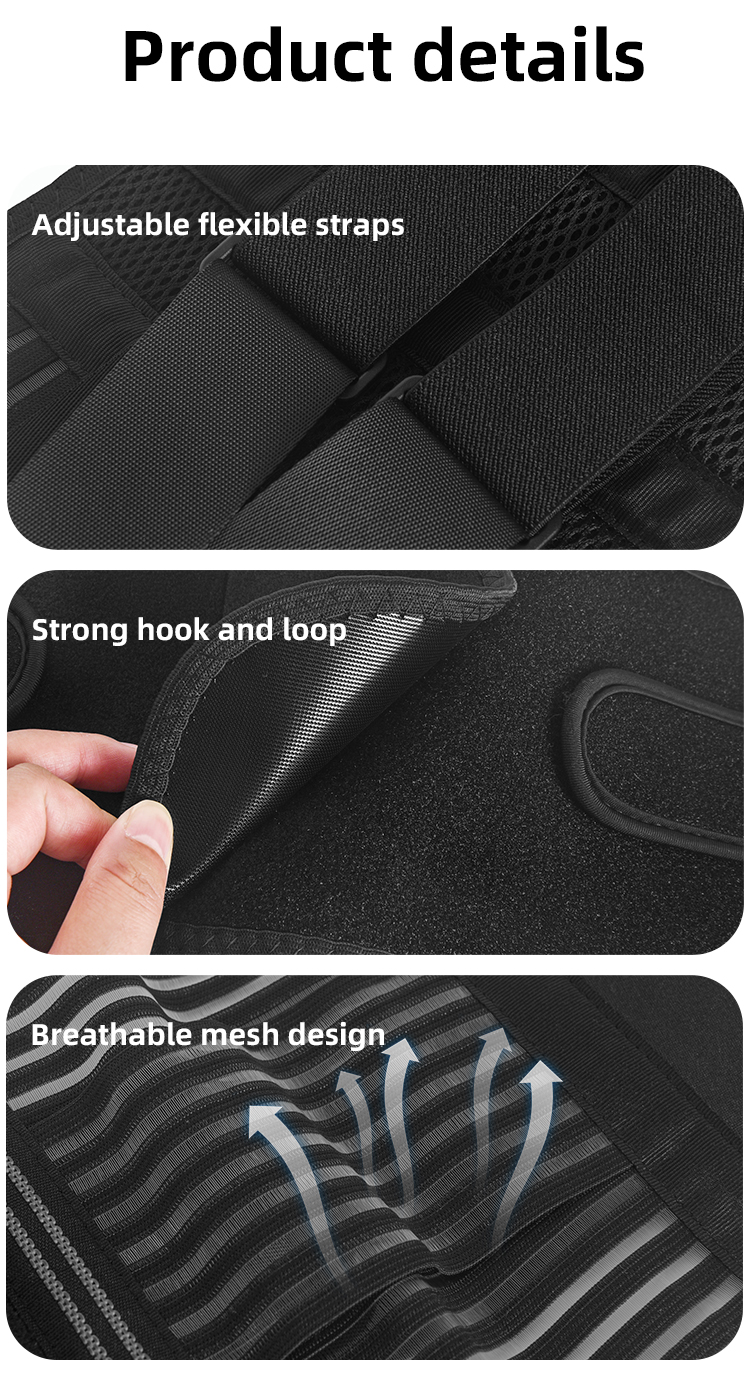 The design incorporates six hybrid aluminum support rods strategically shaped to conform to varying anatomical lumbar curves, delivering reinforced structural integrity. The adjustable double strap system allows for modular compression adjustment, tailoring pressure distribution for individual user needs. The breathable mesh fabric provides lightweight durability maintaining airflow to minimize heat retention. This combination of adjustable waist support belts and advanced structural elements facilitates ergonomic integration in diverse operational settings.